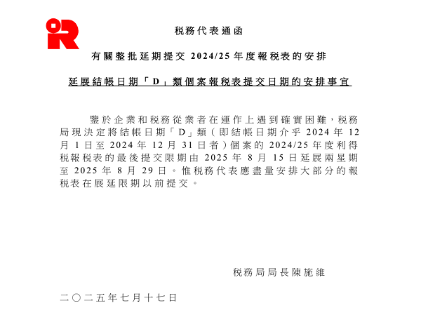 香港税务局于2025年7月17日发布通告,鉴于企业与税务服务机构的年底结账操作困难,正式延长D类公司(财务年度结束于2024年12月1日-31日)的利得税申报期限——由原定的2025年8月15日延后两周至2025年8月29日。本次延期旨在缓解申报压力,但需注意8月29日为最终截止日,逾期将面临合规风险。