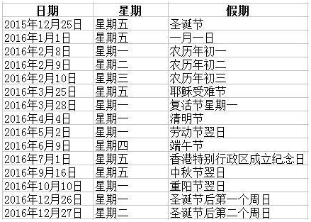 ¾ÝÏã¸Û½»Ò×ËùÍøÕ¾ÏÔʾ£¬³ýÖÜĩ˫ÐÝÍ⣬2016ÄêÏã¸Û¹ÉÊÐÖÐÒò½Ú¼ÙÈÕÈ«ÌìÐÝÊÐ14Ì죬ÇÒÈ«ÄêÎÞ°ëÈÕÊС£