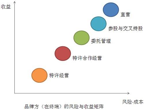 ÔÚÕâÕÅͼÀÎÒÃÇ´óÖ¿ÉÒÔ¿´³öÆ·ÅÆ¹«Ë¾ÔÚ¶ÔÖÕ¶ËÎåÖÖ²»Í¬µÄ·½Ê½¿ØÖÆÂ·¾¶Ï£¬ËûÃǵķçÏÕ-³É±¾ÓëÊÕÒæµÄ×éºÏ¡£Á¬Ëø¹«Ë¾¾ÓªµÄ³õÆÚÍùÍù»á×¢ÖØÖն˵ÄÊýÁ¿¶ø·ÇÖÊÁ¿£¬ËùÒÔ»áÑ¡Ôñ½ÏСµÄÊÕÒæÓë½ÏµÍµÄ·çÏÕ-³É±¾£¬µ±ÖÕ¶Ë¡°È¦µØ¡±Íê³ÉÖ®ºó£¬ÖصãÔòתÈëµ¥µêµÄÓ®ÀûÄÜÁ¦ºÍµ¥µê´ø¸ø¹«Ë¾µÄÓªÒµÊÕÈë¡£ÎÒÃÇ˵ûÓÐÒ»ÖÖ°®ÇéÊÇ×îºÃµÄ£¬²»Í¬µÄ½×¶Î¿ÉÄÜ»áÐÀÉͲ»Í¬µÄÁµ°®·½Ê½£¬Æ·Åƹ«Ë¾Ò²ÊÇÈç´Ë£¬×îÖØÒªµÄ»¹ÊÇÒª¸ù¾Ý×Ô¼º×ÔÉí×ÊÔ´ÓëÄÜÁ¦£¬ÔÚ¹«Ë¾Õ½ÂÔµÄÖ¸ÒýÏÂÑ¡ÔñÒ»ÖÖ»òÊǼ¸ÖÖµÄÁ¬Ëø×éºÏ¡£
