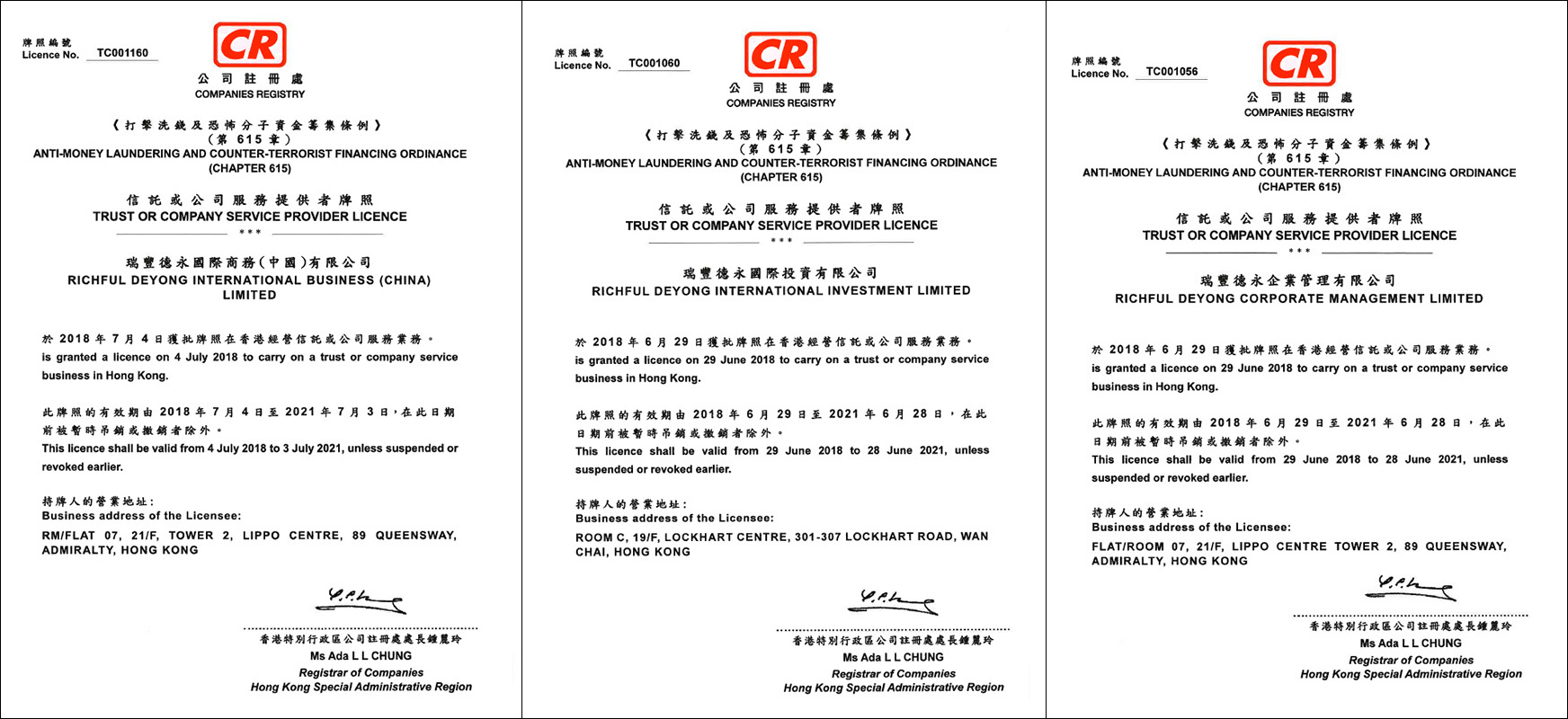 信托或公司服务提供者牌照:TC001160、TC001060、TC001056