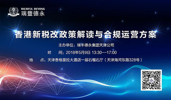 2018年5月9日,瑞丰德永将在天津举办“香港新税改政策解读与合规运营方案”专题研讨会,特邀专家为您全方位解读税改新政,从法律和税务的专业视角,真正帮助企业家理解新政背景下,实现合法合规经营的税务筹划正确之道。
