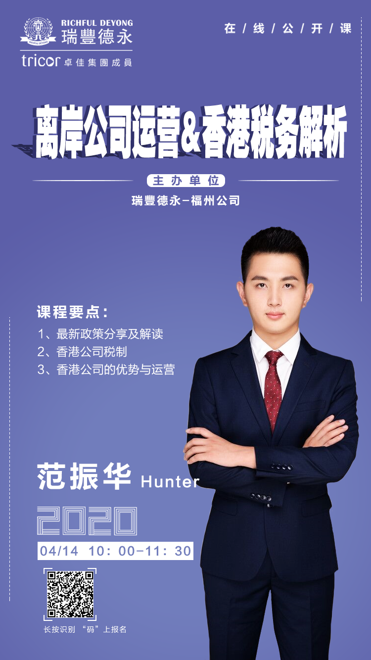 瑞丰德永将在线为您解读香港最新政策,分析香港公司的优势及当下香港公司运营的难点和重点,分享香港公司税制及报税以迎接2020年报税季,为企业发展保驾护航。